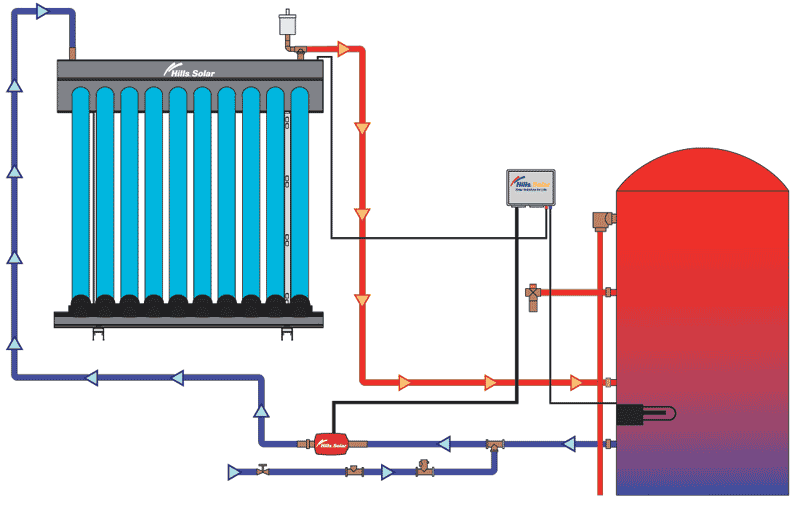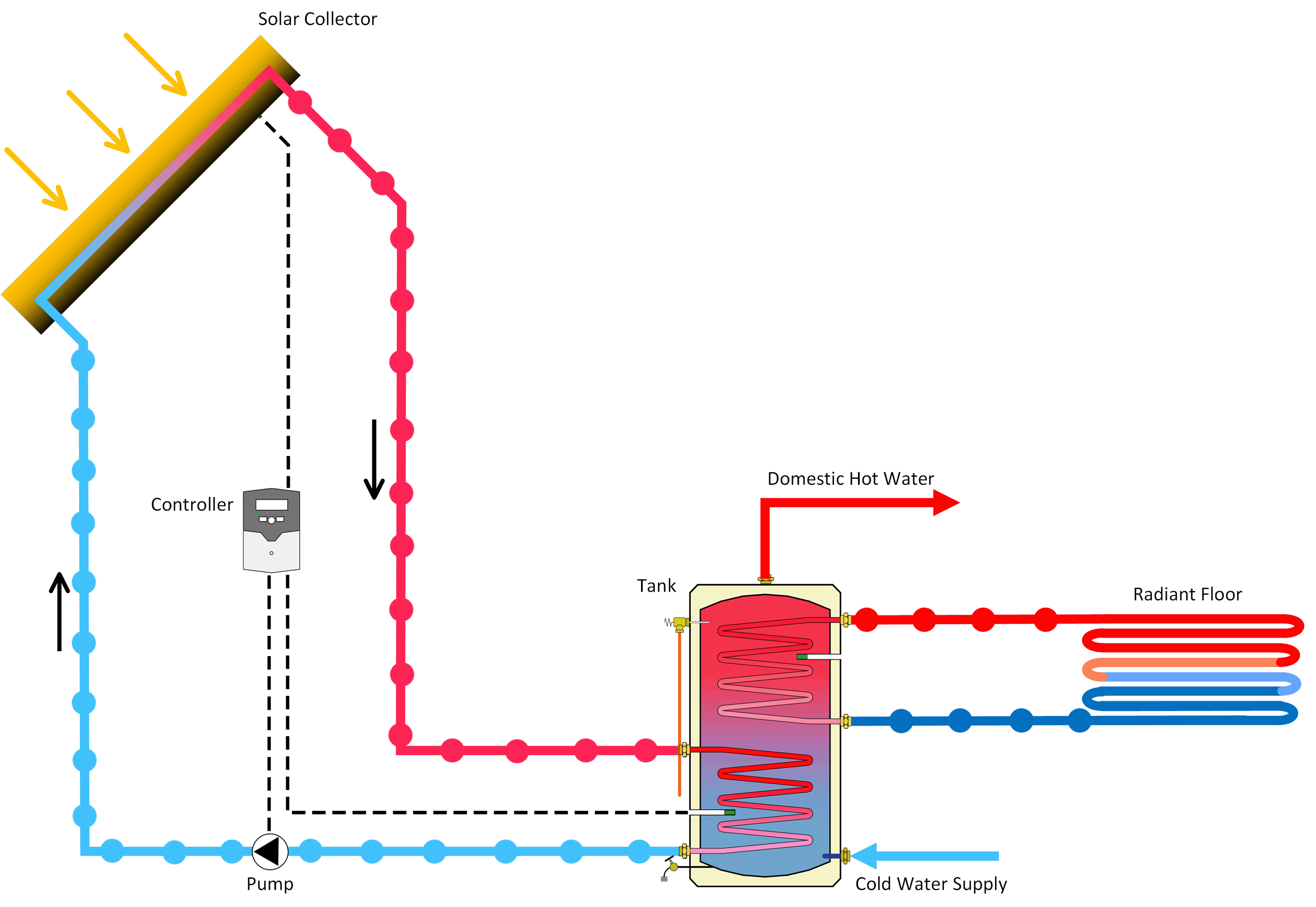 Active solar water heating systems use mechanical pumps and differential controllers to manage the flow of heat-transfer fluid or water from the solar collector to the storage tank. These controllers monitor temperature differences between the collector and the tank. When the temperature of the water in the collector is higher than that in the tank, the system activates the pump to transfer heat efficiently. The pumps in active systems can be powered either by mains electricity or by solar photovoltaic (PV) panels. Some systems rely entirely on solar energy to circulate the fluid during daylight hours, storing the heated water in well-insulated tanks for use during the night. Others include a mains-powered backup to ensure consistent operation during cloudy days or at night. Unlike passive systems, active systems do not rely on gravity for fluid movement, which allows greater flexibility in tank placement. Storage tanks can be located inside attics or other insulated indoor areas to reduce heat loss. These tanks can also be integrated with existing hot water cylinders, allowing the solar system to preheat water for household space heating—especially beneficial during winter months. Active solar systems offer greater efficiency and flexibility, making them ideal for homes requiring reliable year-round hot water.